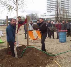 Damit der Kulturpark bei all der Euphorie, daß es mit dem Parkplatz endlich los geht, nicht vergessen wird, haben am 7. April 2004 die Beteiligten von KuK Kreativfabrik und Wassermueseum zur Pflanzung dreier Bäume auf dem zukünftigen Kulturparkgelände eingeladen. Jetzt hoffen wir, daß die Detailplanungen und damit die Kostenberechnung von Seiten der Stadt in die Gänge kommt und eine erste Grundbegrünung im Herbst tatsächlich folgt. Weitere Infos (Nachtrag Herbst 2004: Inzwischen ist der Parkplatz fertig und wir warten mit Spannung, was sich in Richtung Kulturpark weiterentwickelt.) Weitere Infos
